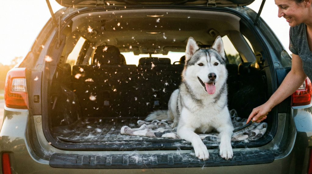 2. The Pre-Ride DeShed: Use an undercoat rake (like a Furminator) for 5 minutes before the dog enters the car. Every hair you remove in the driveway is one less hair you have to scrape out of the trunk liner later.